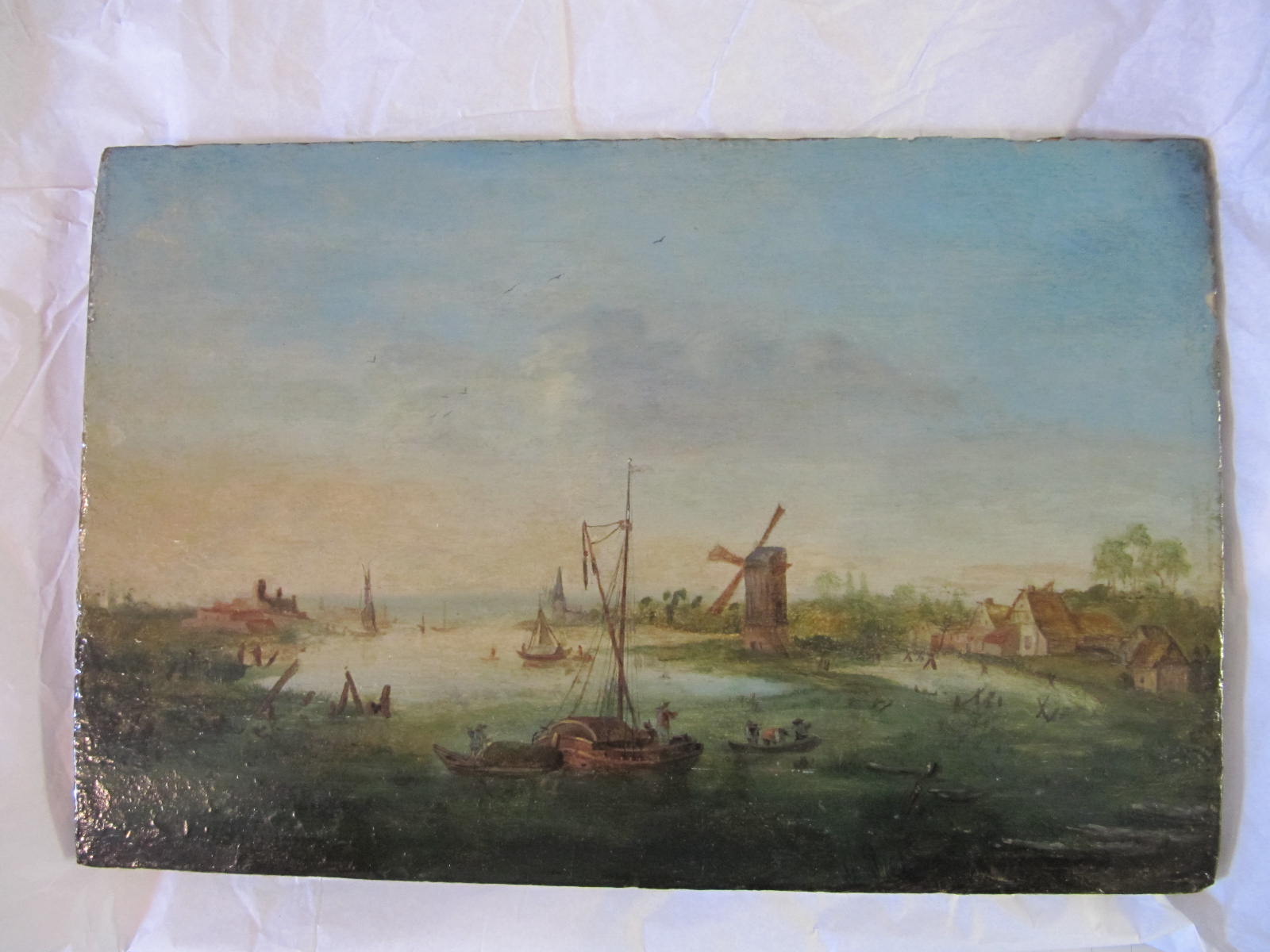 Fort soulèvement avec perte de matière peinte, Refixage par la face, nettoyage et allègement du vernis.Masticages des lacunes et retouches intégrées avec reconstitution de dessin